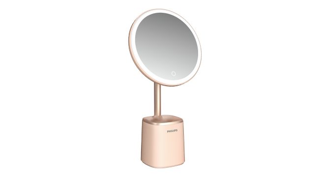 高显色 CRI 和明亮出众的照明质量。一键调光。二合一设计,带储物底座。专业化妆光效。