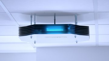 UV-C 射线分布在设备水平位置及上方,可大面积为房间上空静音消毒,设备下方的空间则可继续进行商业活动。飞利浦 PL-S TUV 灯包含 4 根 9 W 灯管。UV-C 灯经证实可有效灭活经过测试的病原体。